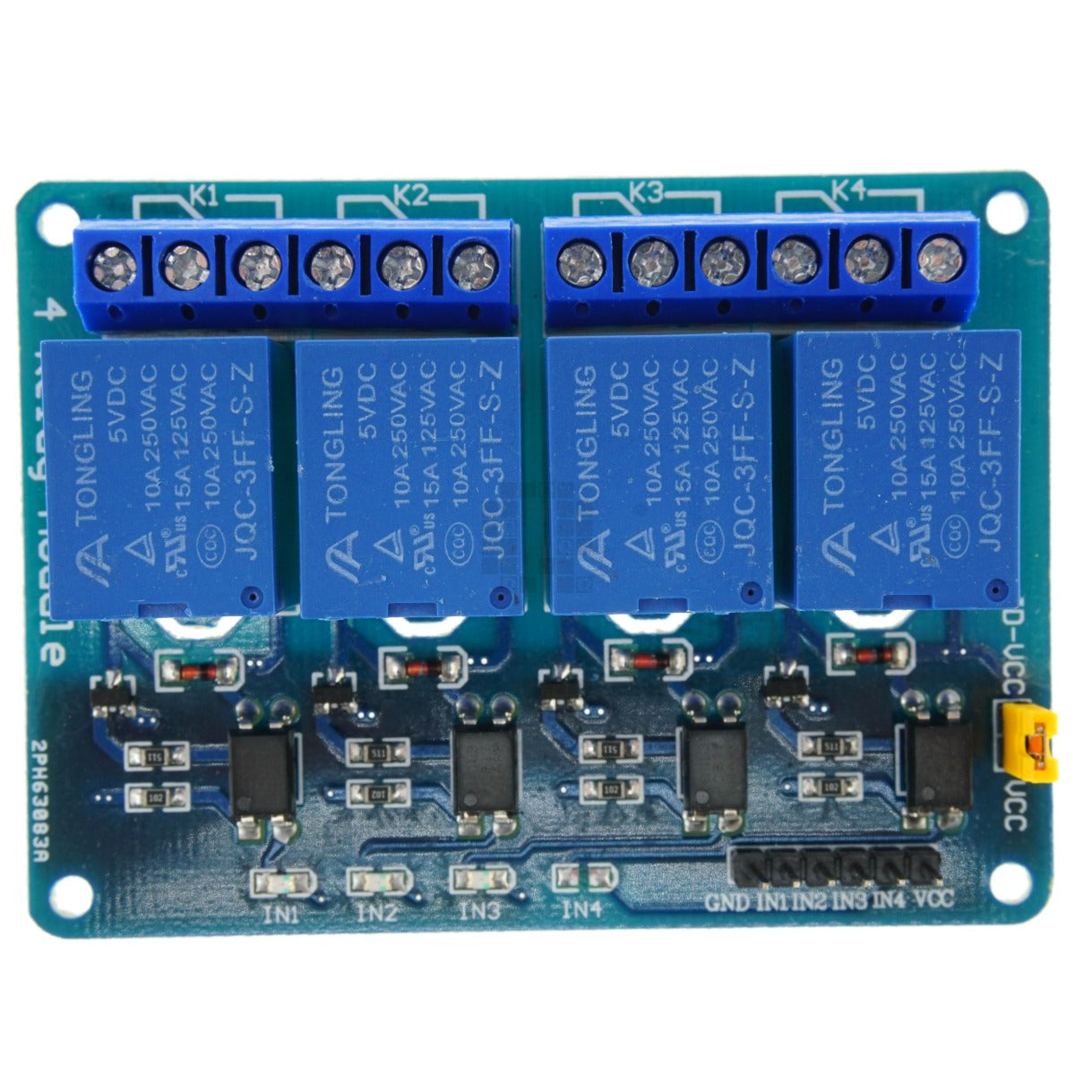 0VDC to IN1-4 should light red LED/activate relay